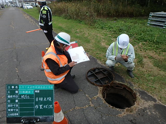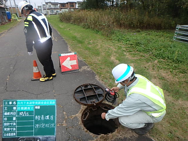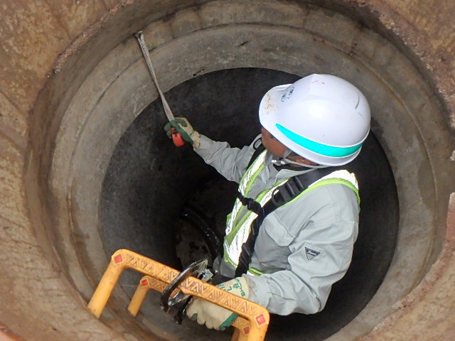 | 工事説明 | 「マンホール目視調査」は調査員がマンホール内に入り側面や足掛かり金物、インバート、管口等の内部状況を目視により把握します。 上下流の管きょ内部の状況についてはマンホールから目視できる範囲を調査します。 また、マンホールに入る場合には酸素濃度・硫化水素ガス濃度等を測定し、安全を確認する必要があります。 必要な場合には送風機等で換気を行う等、万全の安全配慮が必要です。 |
